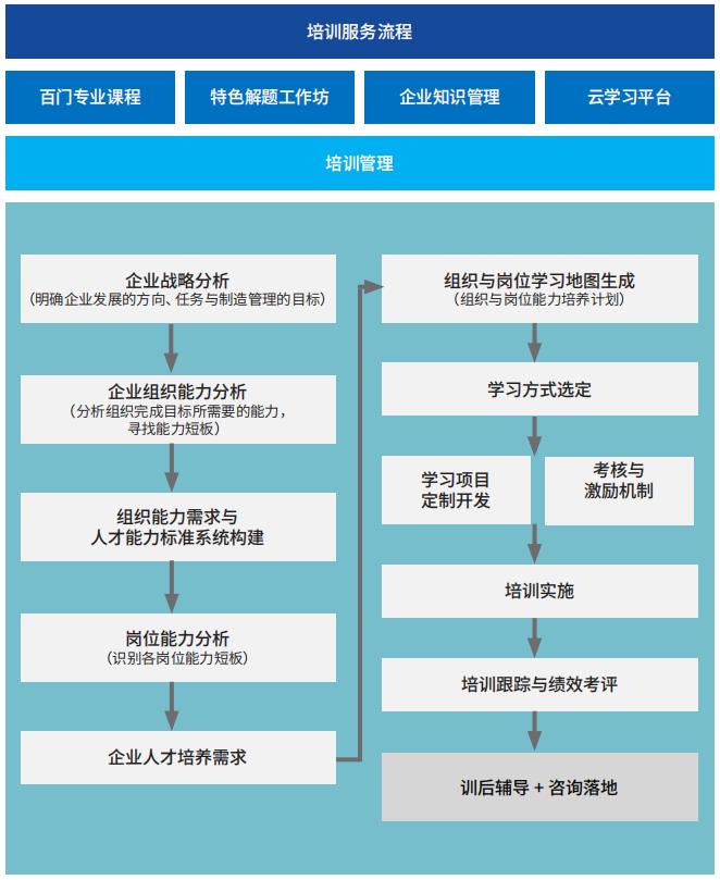 華昊企管學院提供企業(yè)制造管理及創(chuàng)新專業(yè)領域的培訓總包服務,也可提供單門或多門課程的培訓服務。學院總體服務流程如圖: